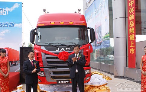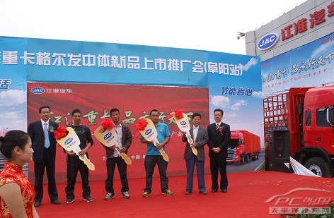 伴随着治超的全国化、常态化,油价高企和物流竞争的加剧,物流用户实现运输利润面临着慢慢的变大的困难,市场呼唤一款既能满足高效运输需要、使用成本又低的高品质物流重卡。格尔发中体载货车应运而生,9月26日,江淮重卡在安徽阜阳市举行新产品全国上市首发仪式,在江淮汽车领导、各地经销商、用户以及媒体近两百人的见证下,江淮汽车副总经理、商用车公司CEO赵厚柱为新车揭幕,格尔发新品中体载货车惊艳亮相。现场宣布首款270马力高顶商品市场售价24.56万元,极富竞争力的定价赢得经销商和用户热烈的掌声。